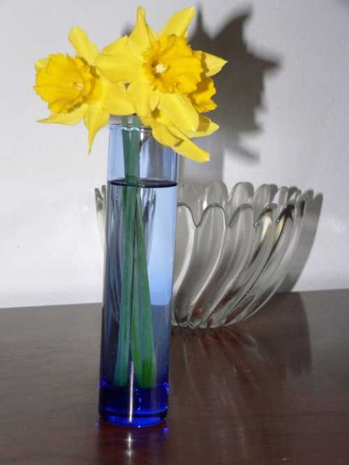 I walked around the yard yesterday and found THREE daffodils in bloom! I brought them in for us to enjoy, since we’re supposed to have a cold snap tomorrow night and it’s back to winter for awhile. We have more blooms today!