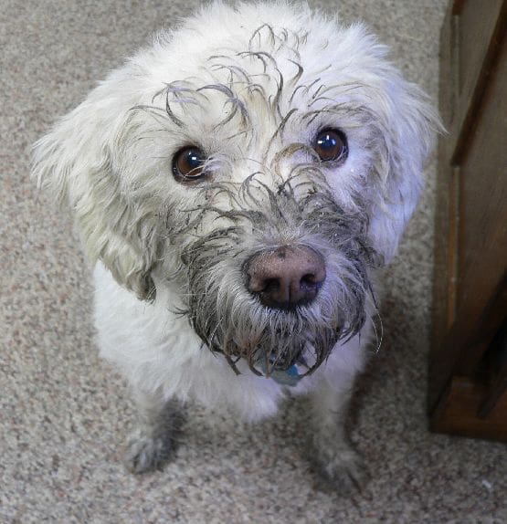 This is Molly after playing out in the rain and mud this morning. She was SO awful I had to bathe and try to dry her (three baths towels and the hair dryer) enough so she could be with the family again.