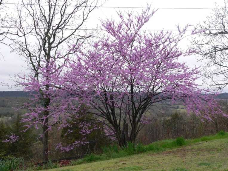 Since 2 of our 8-foot brick planters in the front collapsed and have to be rebuilt, we’re very short on sprouts and blooms this spring. The exception to this, though, is a lovely display of bloom from the redbud trees that Mother Nature dotted around. We love each of them and cut away things around them that might encroach, encouraging them to be healthy and happy.