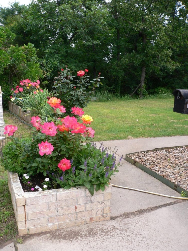 We love Rio Samba roses because they start out bright yellow. Then they develop coral edges on each bloom. Finally they turn coral before it’s time to prune them off to encourage new blooms.