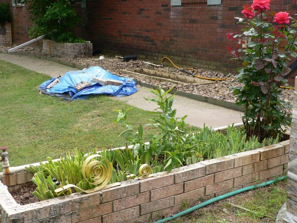 I just enjoyed walking around the yard, taking stock of what’s what while marveling that it wasn’t raining! Right now it’s 70 degrees F.! Just gorgeous. I wanted to show you the results of my trying to create a bit of order from the chaos created by Mother Nature recently. Here is one of our Rio Samba rosebushes. I pruned the three we have so they’ll bloom again in a couple of weeks. You can also see the tarp that is hopefully preserving the potting soil we removed from one of the two planters that collapsed. We are trying to gear up for rebuilding these ourselves, since the only estimate we’ve been able to get from an actual bricklayer was WAAAAAY too high.