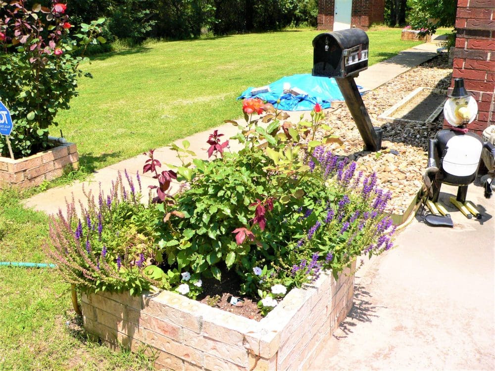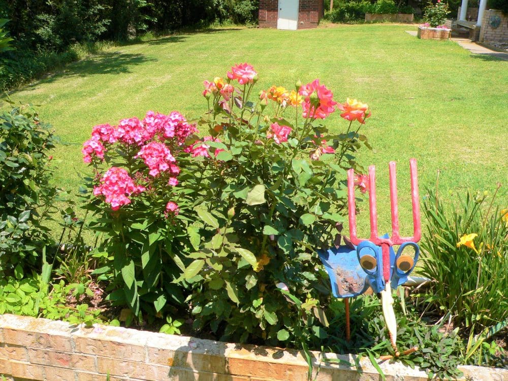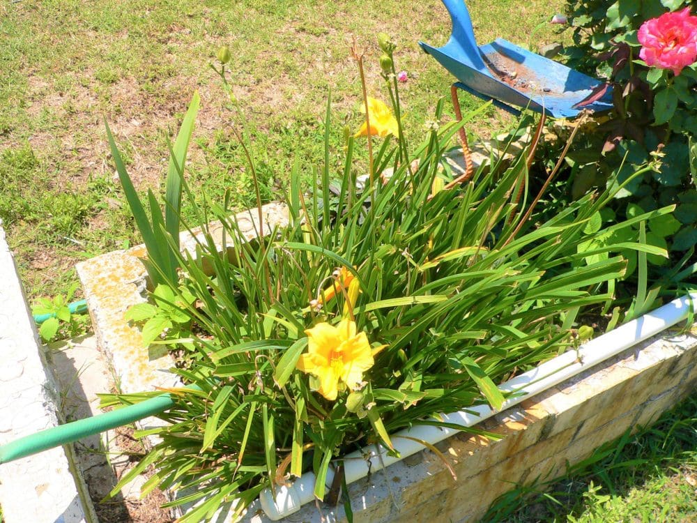 The roses I pruned are starting another bloom. (Plus, you can see the second planter we’re going to rebuild and the pile of potting soil waiting.)