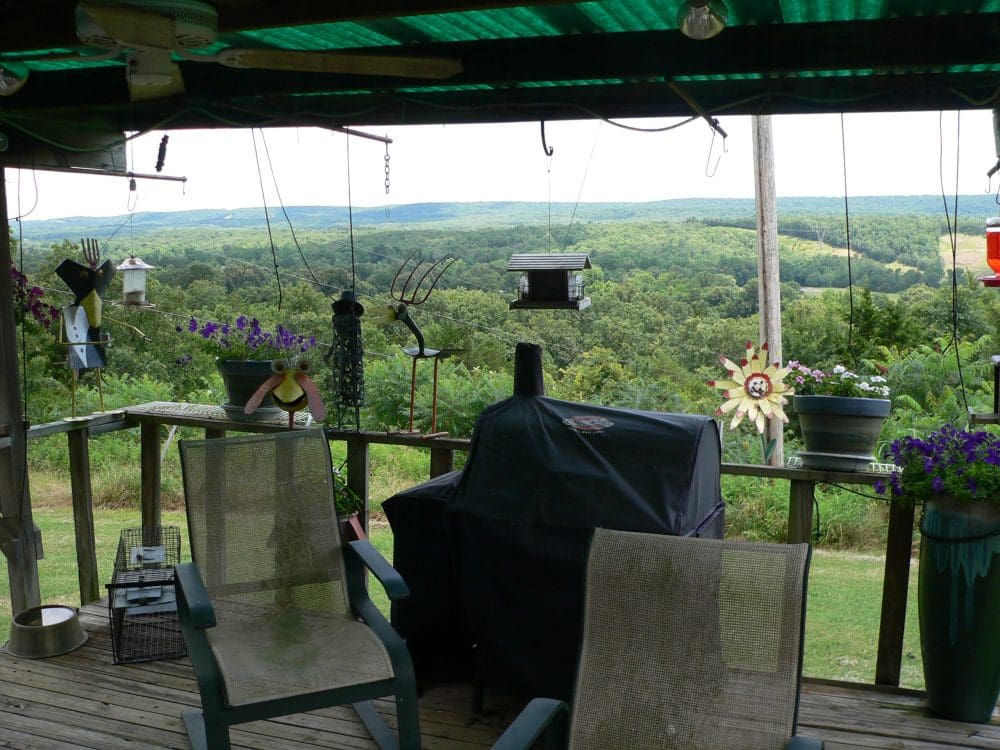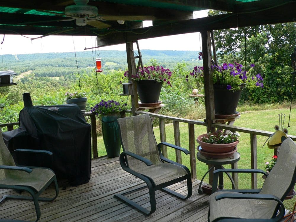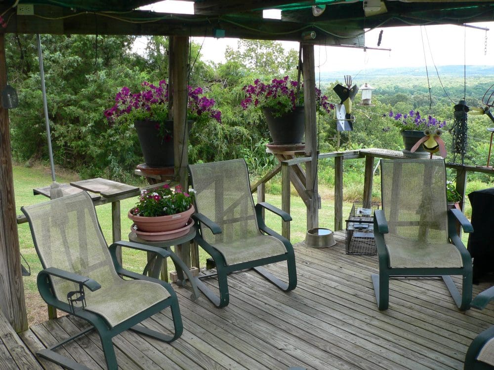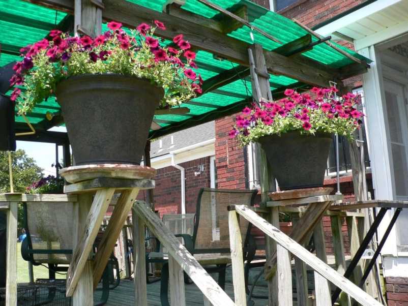 One view of our deck. We usually plant mandevilla in the 4 large pots, but we think the wave petunias this year are wonderful.