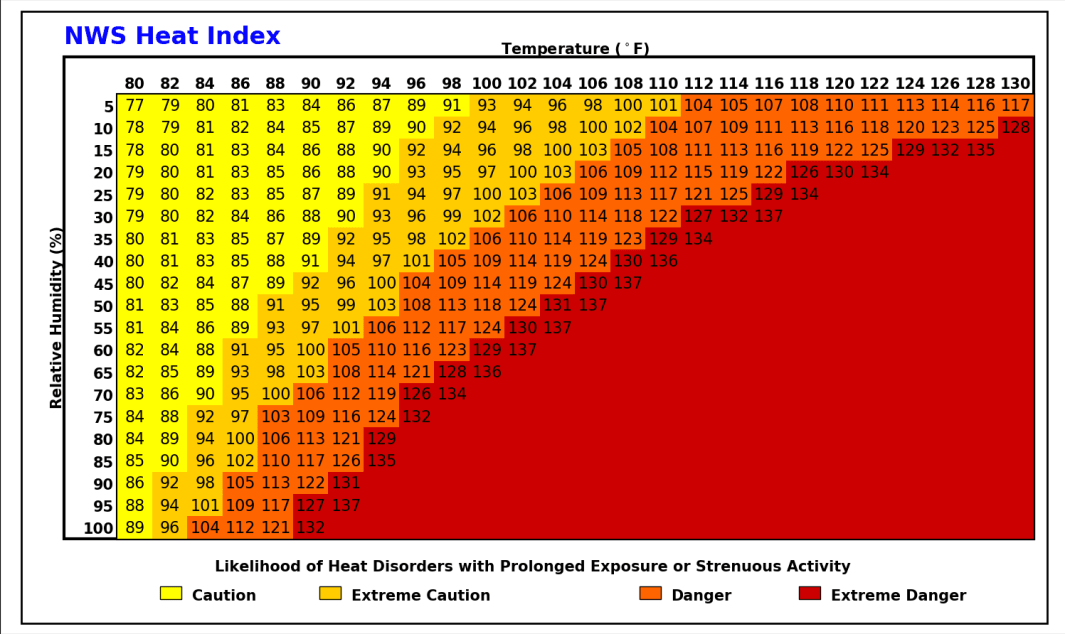 Our actual temperature right now is 91 degrees F. The humidity is 63%. That means we’re between the “Extreme Caution” and “Danger” areas of the chart. Oh, JOY.