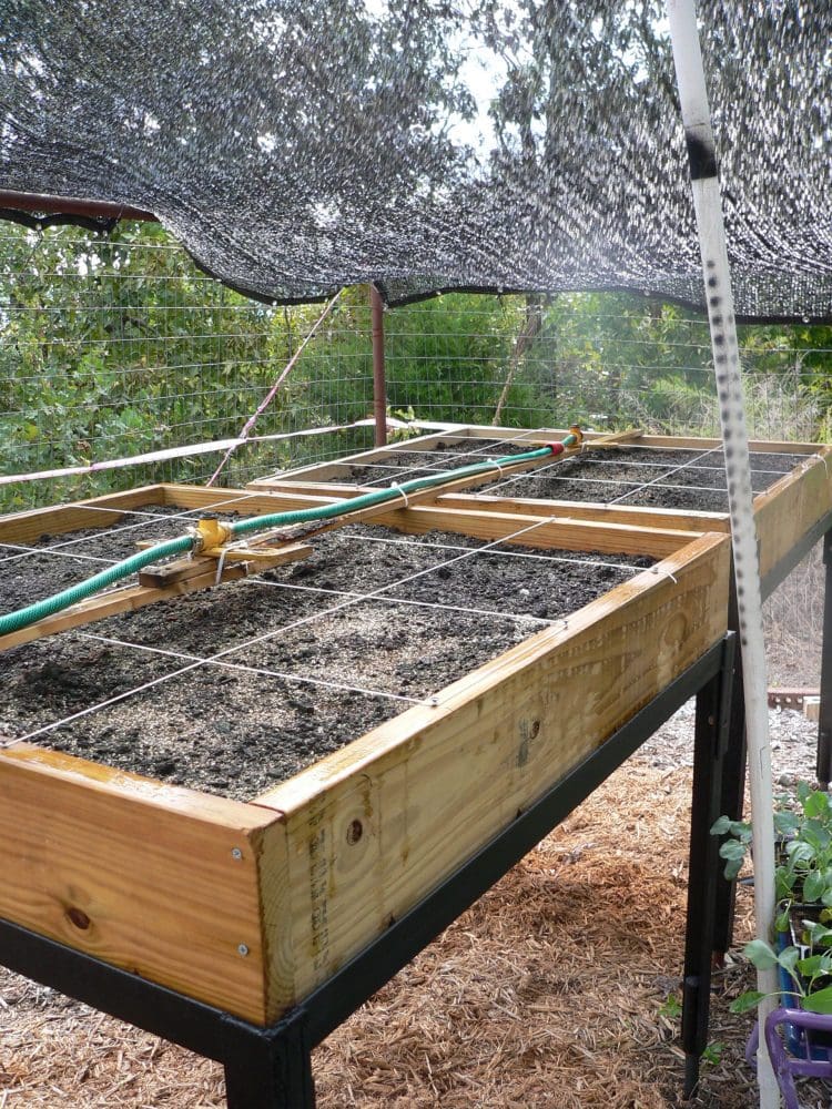 This is an old picture of one of the raised beds in our square foot garden. We don’t have the shade fabric over the top anymore and the beds are looking nice and clean in this picture. REALITY Is lot of old plants that have given up the ghost in the relentless sunshine and weeds all over the place.  :0/