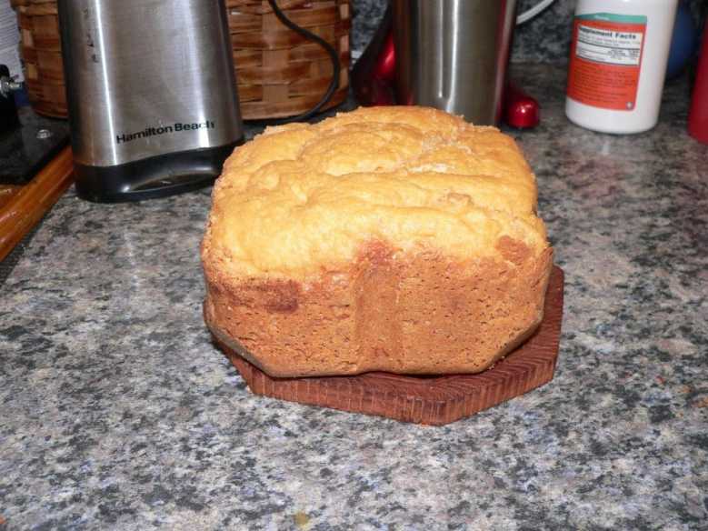 The loaf above was my first try. This was a recipe for the oven. I sliced two thin slices for my husband and I to try. My husband was not impressed. I thought it was okay. I went into the kitchen to wrap up the rest of the loaf, only to find it GONE. Amber, our 94-pound 2-1/2 year old yellow lab, had eaten the entire thing! (She gave it 2 thumbs up.)