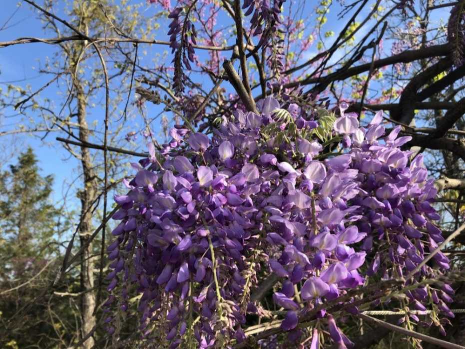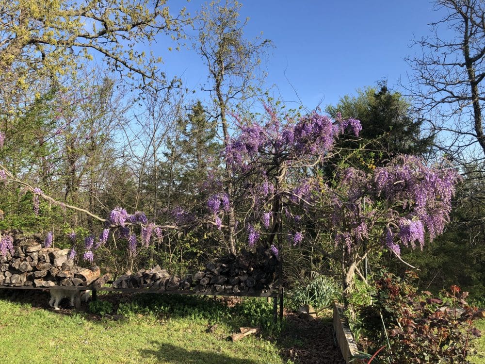 We have been working to get our wisteria to grow from its base in the planter on the right of the photo to a tree off the edge of this picture on the left.