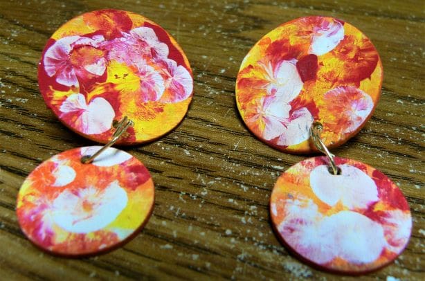 These are yellow/orange/rose/white hand-painted clip-on one-of-a-kind super light weight wooden dangle earrings. These are 1-1/4″ in diameter on the top disc, with a 3/4″ dangle attached. Total length of the earring is 2-1/4″. Painted plain orange on the backs. Clips and glue are nickel-free. They are on sale at Rags & Roses Collective for $9.99.