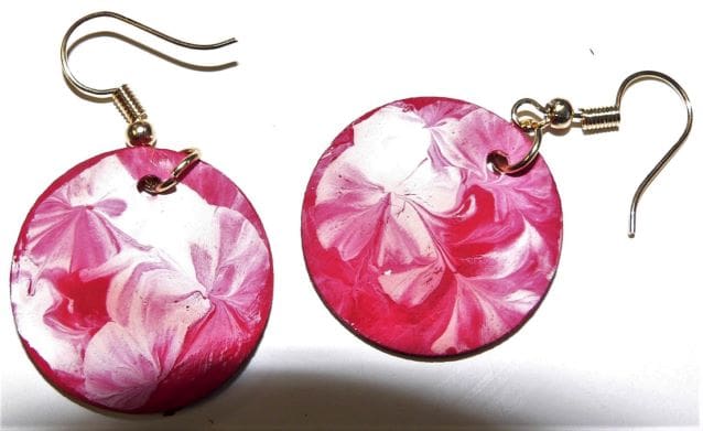 Red & White Hand-Painted One-of-a-Kind Super Light-Weight Wooden Round Pierced Earrings. The wooden earring is 3/4″ long. The earring is painted plain red on the back. French hook. Love them yourself or give as a fun gift! These are on sale at Rags & Roses Collective for $9.99.