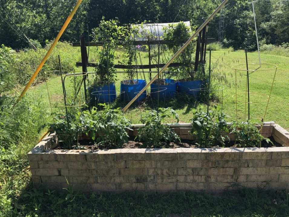 Yesterday I spent a lot of time weeding, staking, and tying up tomato plants to make them as secure as possible with all the waves of severe weather we’ve been having. So far, they seem to be doing fine. I have six plants in this planter.