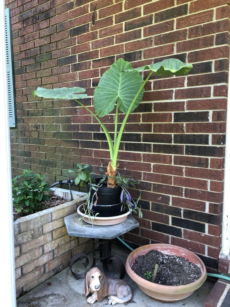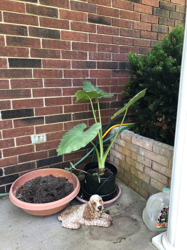 Last fall my friend, Laufrain, dug up her elephant ear plants to winter over until the spring. She gave me TWO of them! I put them in our dining area on the floor and held my breath that I could keep them alive until I could give them a home on our front porch in the spring.