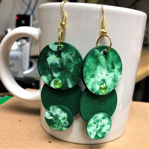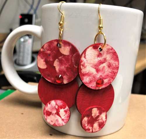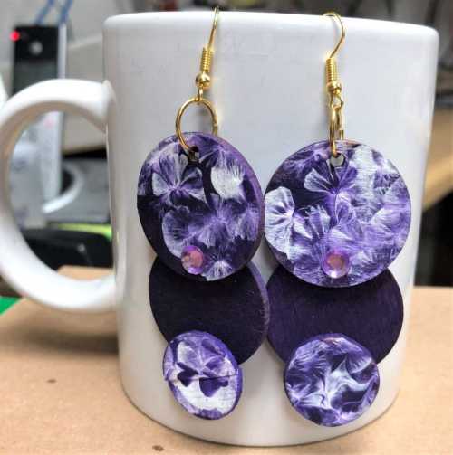 There are three hand-painted discs put together to make these earrings. The length of the earring is 2.5″. They have a French hook.