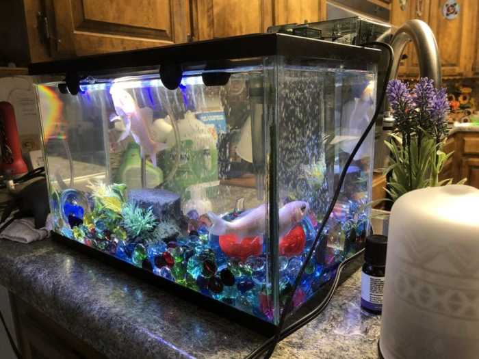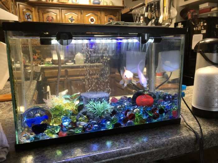 I love my fish. I like going past the aquarium umpteen times each day, talking to them, seeing the clean tank and water, feeding them, and occasionally finding another decoration I hope they’ll enjoy. The smaller, almost white gold fish is about 3 times as large as it was when I bought them. The gold fish is a good 4 or 5 times as large as it was. They seem healthy and happy. Hopefully the new algae killer/fighter will help me keep the aquarium nicer.
