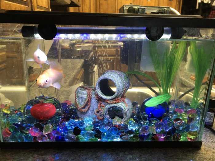 When I got everything back together – all squeaky clean – the fish checked everything out avidly, noting the differences in decorations, but mainly looking to see if I gave them extra food. They got in the corner, blowing bubbles at me and wriggling their bodies, and I caved, as usual, and gave them a bit extra.
