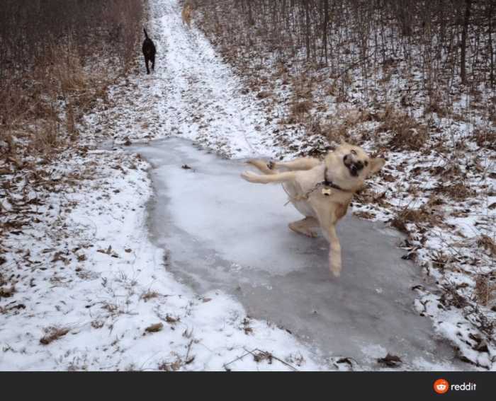 Amber, our 95 pound yellow lab, discovered the hard way that ice is slippery this morning. She went rushing out, barking, as she does routinely, and ended up sliding all the way down the sidewalk behind our house. I didn’t see the look on her face, but I know she was shocked.