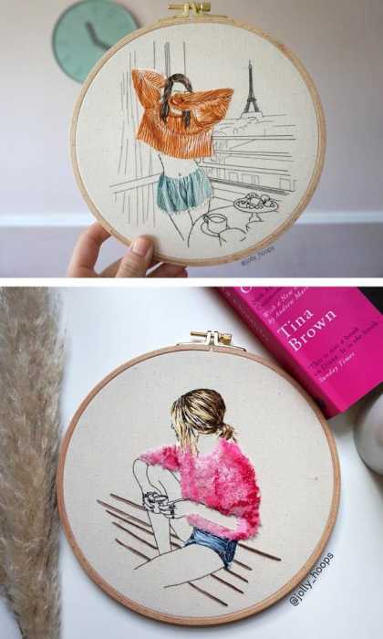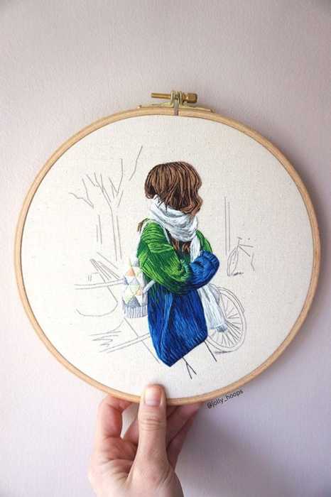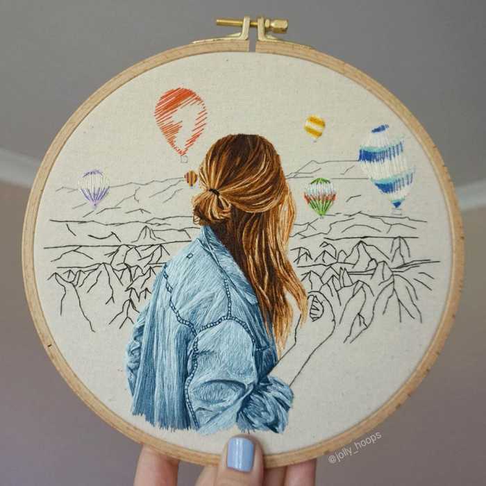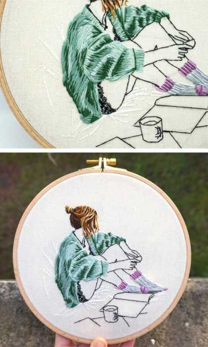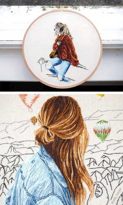 This lady takes the idea of traditional embroidery and stands it on its ear. I can’t say enough about the creativity and skill shown here. There are no ‘patterns’ available for things like this. The fact that she can make the shirt ‘denim’ and the hair highlighted and simply gorgeous blows me away.