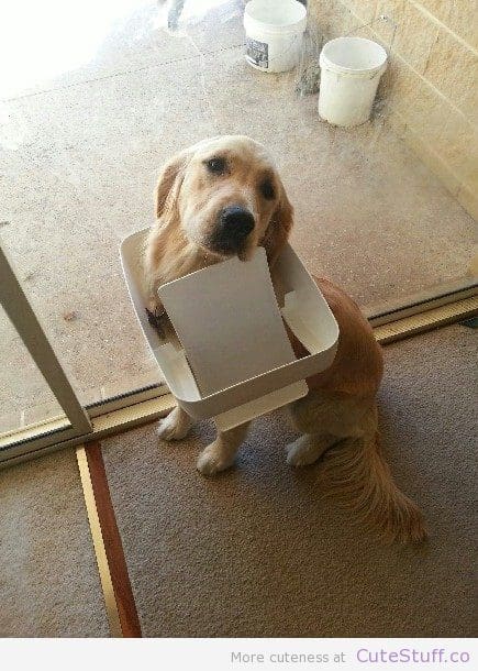 After I let Amber back in, I was carrying our frozen dinner in and found Amber with her head in our flip top trash can in the pantry. (This pic gives you an idea) I yelled at her. Her head came up abruptly, with the red flip top stuck on her head! She started to thrash around the pantry, causing havoc. I got her stopped, got he trash lid off her head, and I HIT her with our frozen dinner. It didn’t hurt her, but she seems to have gotten the message that she wasn’t supposed to help herself to whatever was in the trash. (Our dinner seems to have come through fine, too.) This is probably pet abuse, but when you’re dealing with a hard head like Amber, sterner measures must be taken. It took me almost half an hour to gather the trash she had strewn, plus pick up the things she knocked off the pantry shelves as she thrashed around with the trash lid. And all this was right before she KNEW I would feed her!