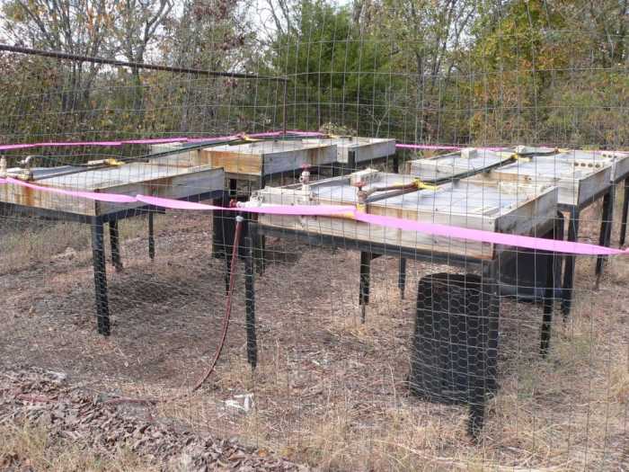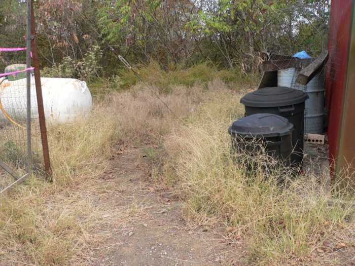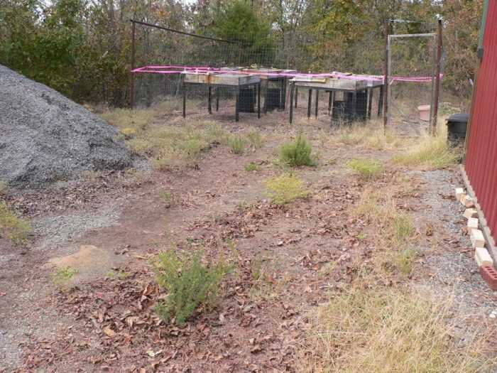 I’ll neaten up the area under the planters with the weed whacker as part of the next part of the project. You can also see the neon surveyors tape I ran around the perimeter of the garden to keep the deer from running into it.