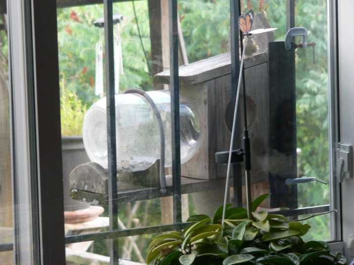 Here he is, right before he flies away. I sat and sat, camera at the ready, trying to get a close-up, but he catches the movement on the other side of the glass and flits away. You can see him a little better in this pic, just to the right of the butterfly.