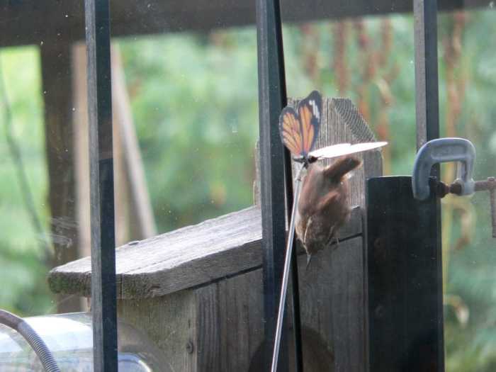 I have spent three days off and on trying to get a good picture of a sweet little bird who sits on a feeder in our dining area window and talks and pecks at the ‘bird-in-the-window.’ If you look carefully at the pic above, you can catch a glimpse of him just below the butterfly.