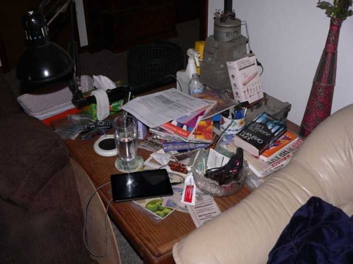 It embarrasses me to admit and show you what a slob I am, but though I do try to improve with age, it doesn’t seem that I’m going to change my spots at this point. These two pics show you the table that is between the couch and my chair in the living room. As you can see, an ‘explosion’ happened, and it definitely needs some attention. This is the project for today, along with continuing to work on some paperwork I’m trying to get put away, and getting some chili going in the crock pot, which I did awhile ago.