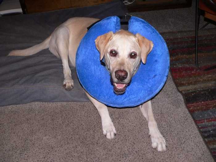 Amber with the soft, neck-pillow type cone. She seems MUCH happier, and so are we!