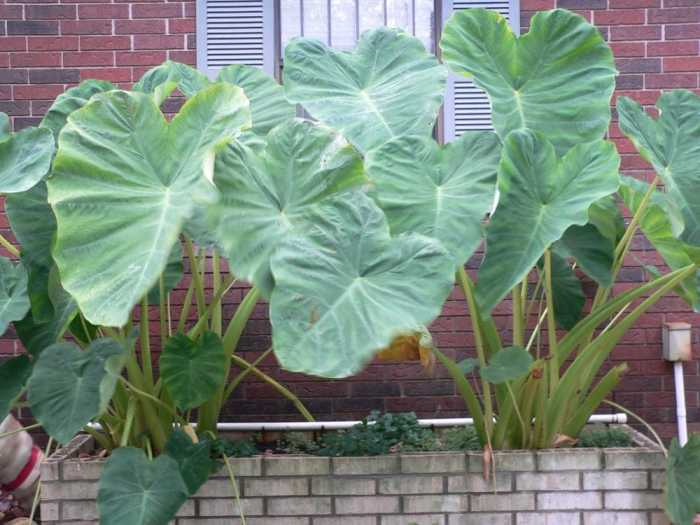 This past year was the best year EVER for my elephant ears, with them almost covering the window and shutters of the garage, reaching WAY above my head and being extremely happy plants.
