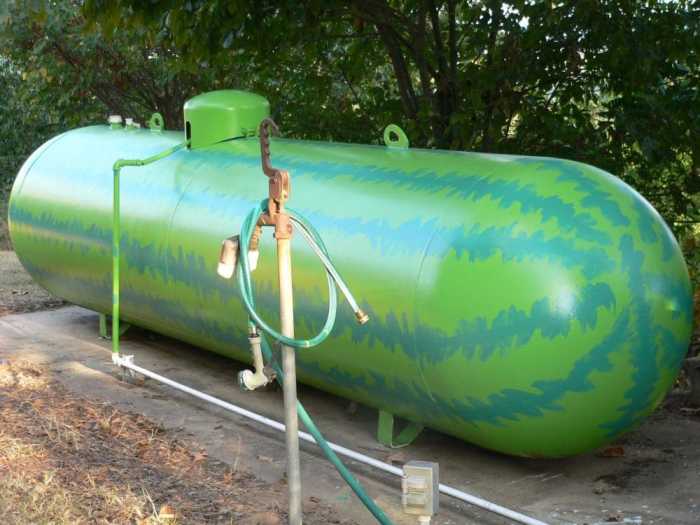 We have a 1,000 gallon propane tank and then a 250 gallon tank. The large one is for the house and the small one for our shop. I painted the large one years ago, trying to make it look like a watermelon, not liking the plain white of the tank.