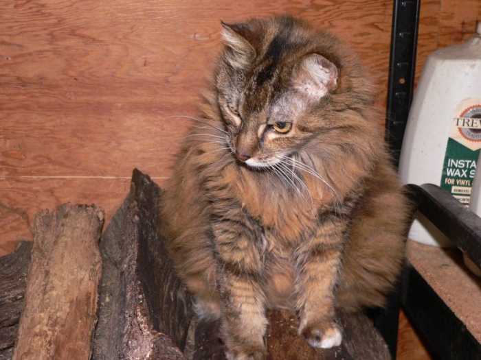 We went out to take our trash down, change the mailbox decoration, and get our mail a few minutes ago. We found Abby on the woodpile in the garage, where she stays during the day. She was still with us this morning and was interested in eating when I went out to feed her.