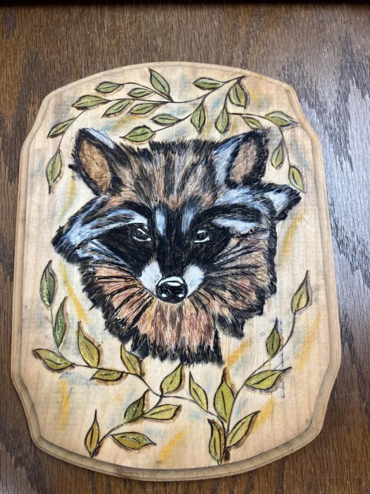 I finished the raccoon wood burned and painted piece last night. I’ll post a pic of it later today or tomorrow.