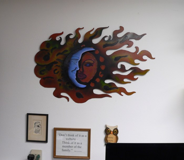 This is one of the 3-D metal pieces my husband and I made and hung in our shared office in Arkansas. The half moon was raised from the rest of the piece.