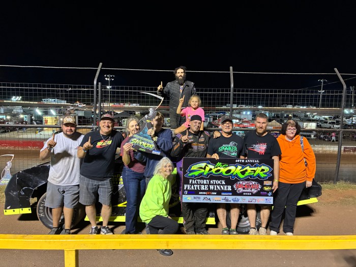 Carla (in the light green beside the sign) and her son have a race car that was T-boned last week at another race. ☹️ It was iffy if they could repair the car well enough to race in “The Spooker Factory Stock Feature. They not only fixed the car and raced – THEY WON!!!!!!! Big congratulations to all involved. 🥳🏆