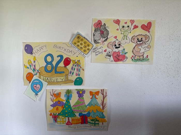 I’m going to try to find a nice image for St. Patrick’s Day to sketch next. I want to sketch and paint something to go on my husband, Harvey’s, wall at the nursing home. I’ve been moving slowly on this, since I didn’t know if the staff and owners would be upset with me or not. Now that they have shown me it’s OKAY, my intention is to build a “Happy Wall” that he can see from his bed, reminding him that he is loved whether Brian and I are there that day or not. – This is the wall so far.