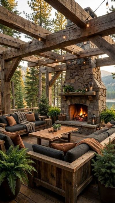 I can imagine all kinds of entertaining here. It looks sturdy enough to withstand rambunctious kids, sprawling teenagers, clusters of adults, a happy couple spending a quiet night together… I love the fireplace and he woods and it looks like water of some kind on out farther.