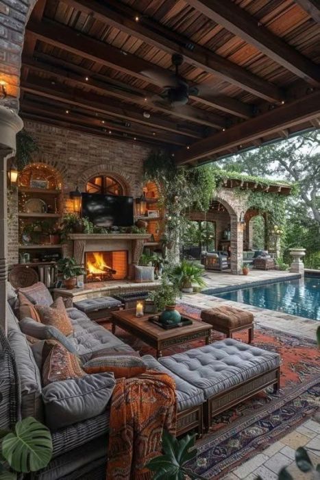 I think this one is my favorite – with the comfortable protected furniture, rugs, fireplace – and then, of course the pool and the extension of the patio…