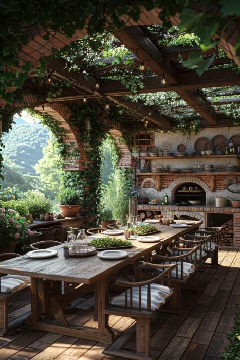But this one is a very close second. Just lovely, with the arched windows and greenery ceiling. I love the humongous table amd the cooking area…