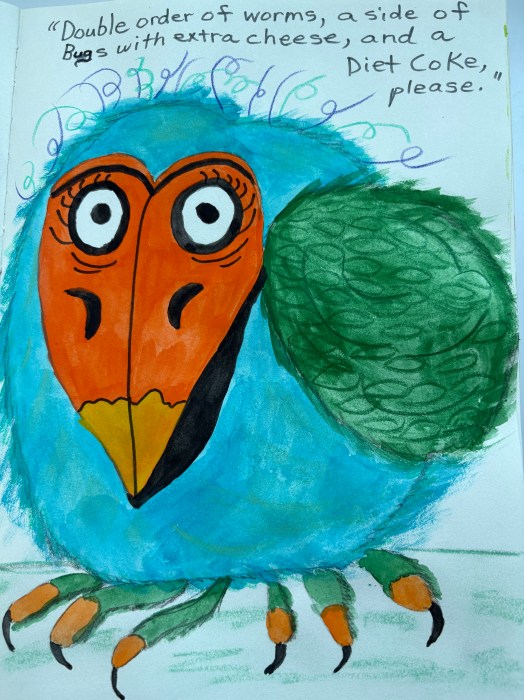 This is my latest painted sketch. I consider this almost a self-portrait of me over the past two years or so, stuffing my face while piously ordering a DIET coke, looking a bit guilty…