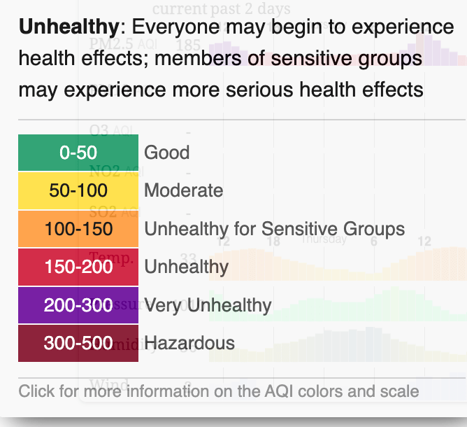 Yesterday it got my attention because the reading was 216 – into the ‘very unhealthy’ range. It has only been that high for that one day so far. I’ll just monitor things, keeping my windows closed and my air filters and a/c on.