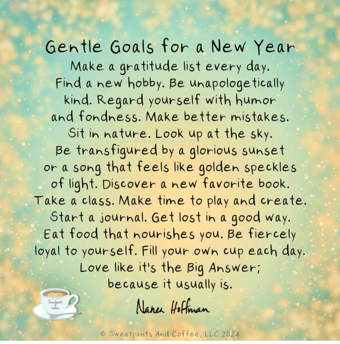 I thought that I would combine this wonderful celebration with a piece by Nanea Hoffman of Sweatpants and Coffee LLC – ‘Gentle Goals for a New Year’ that will help people everywhere embrace new opportunities to improve their lives in the coming year –