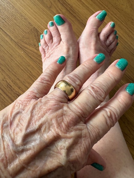 My wonderful son treated me to a mani/pedi this morning. Both he and my husband were remarking that I needed work, so this morning was the morning. Now I am sparkly green! I’m still looking for sparkly ‘cyan’ to please my son, but I only saw a pale sparkly blue, not the more turquoise shade I was looking for. Anyway, I’ve never had this color before, so I’m grinning from ear to ear as I share my ‘elegance.’ We’ll show Harvey Saturday.
