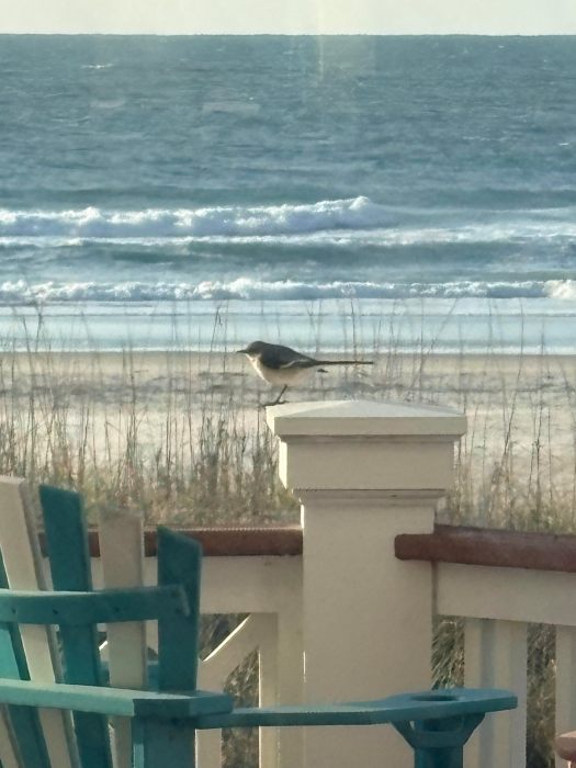 A visitor – close up and personal! My sister-in-law thinks this is a mockingbird. What a special sight this is!