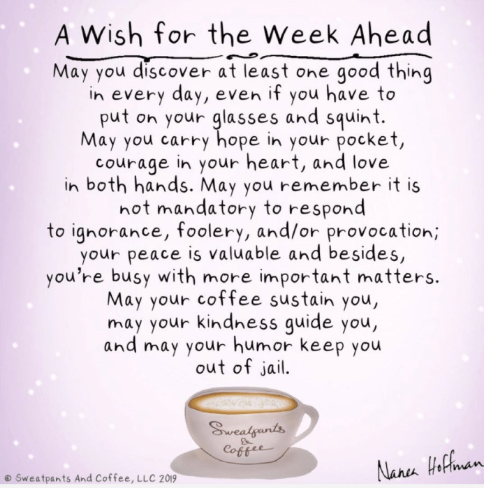 I can’t say enough about Nanea Hoffman. I always find something that resonates, that I needed to hear. This time I snorted when I got to the last line – “may your humor keep you out of jail.”