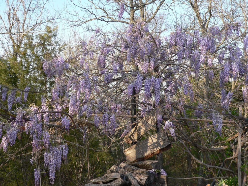 We’re having a really nice display this year. My husband has been trying to get the wisteria to go all the way across over the woodpile, and then climb the tree on the other side. I was standing close to the wisteria yesterday so I could breathe deeply and enjoy its glorious smell, when I realized I was seeing some wisteria in the tree on the far side of the main part of the plant! I brought my husband over so that he could see that his efforts are bearing fruit. He was really happy. He doesn’t grin ear to ear often, but he did this time. :0)