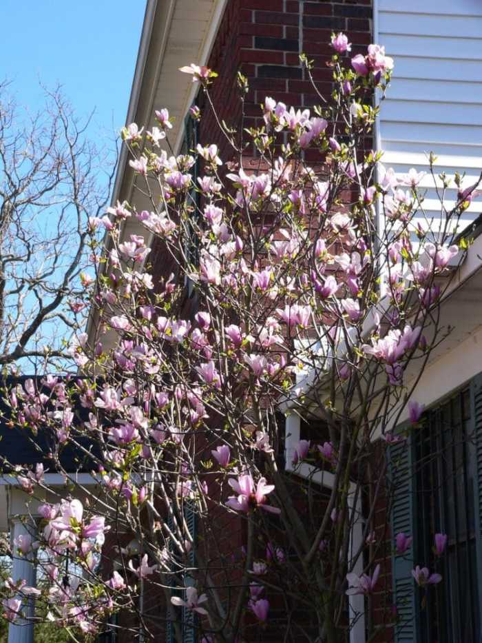 Our tulip tree’s delicate pink and white blooms are gradually changing to light green leaves.