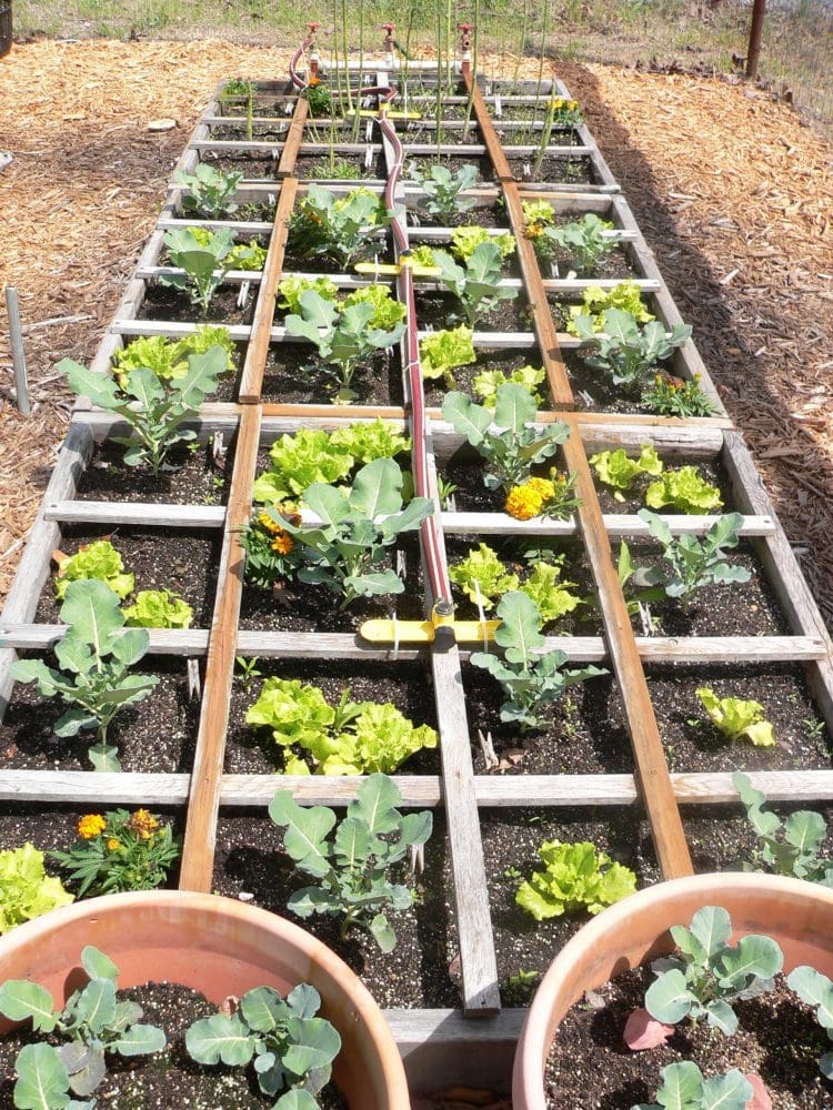 The planters are filled with Mel’s Mix (combination of peat moss, vermiculite and as many different composts as you can find.) We mix the ingredients together in a portable cement mixer and then bring the mix into the planters to top off. Then we stretch string across in two directions to make the ‘squares’ for planting.