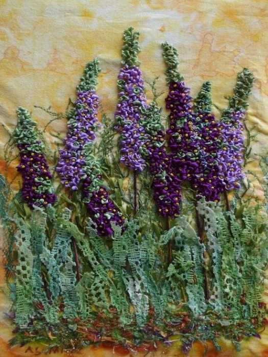 I think this is ‘ribbon embroidery.’ I love the 3-dimensionality of it, the texture, the mixed-media work on some of it, and more. This is a really beautiful art form.