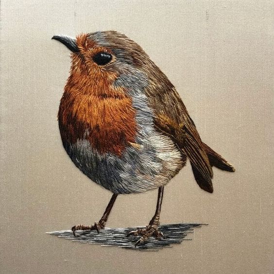 I find a lot of artists who can make beautiful embroidery. Rosa Andreeva, though, takes it to another level. I don’t know if she uses all different colors of cloth stretched on a frame as a background, or paints the background, but I love that each is different. Her embroidery is like a painting, and I love the different levels of 3-dimensional accents so one stands out from the rest. I really like the attention she pays to the background, bringing it into the embroidery with beads, and flower petals, flowing around the main design. Just extraordinary.