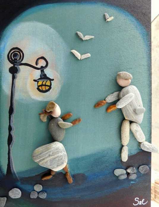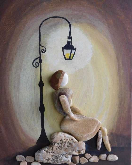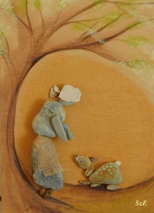 I love the way she mixes media in these. She creates a whole story to go with whatever she has made with the stones or pebbles. She paints the background, and maybe even parts of the pebbles – whatever helps create the mood or message. She also uses twine, branches, glass, wood as accents. I think she is a master of pebble art. I just love what she does.