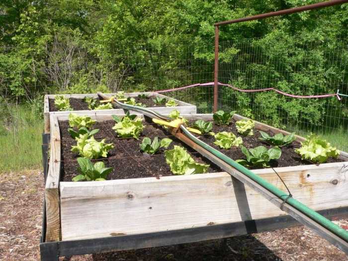 The tables are about my chest height and filled with “Mel’s Mix,” a soil substitute mixture of peat moss, vermiculite, and at least three different kinds of compost. We filled the boxes with the mix, after making the mixture in a used cement mixer. That’s the heaviest part of the gardening I do now. :0)