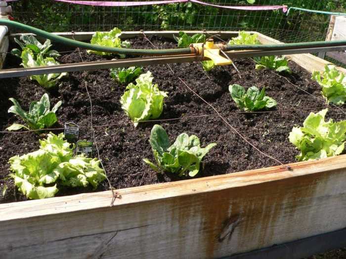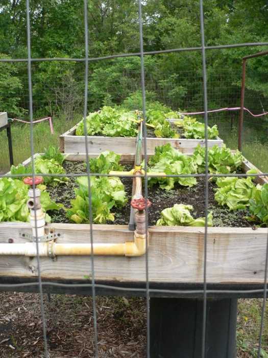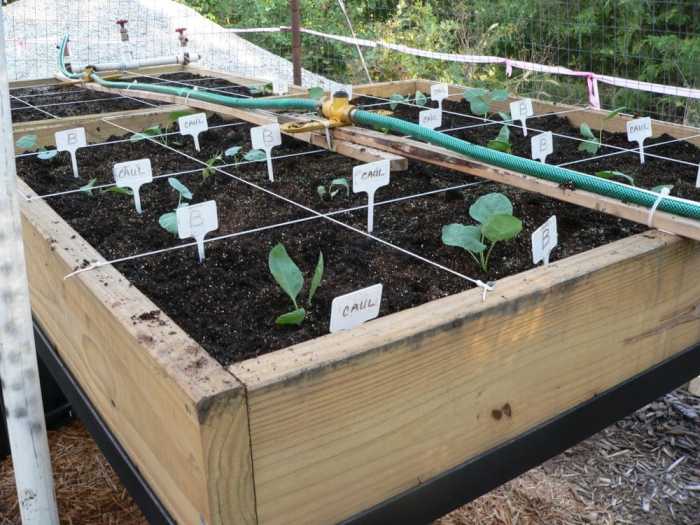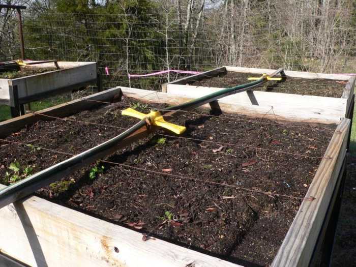 We marked the ‘squares’ of the square foot garden using wire criss-crossed over the tops of the boxes. We mounted a sprinkler head in the center of each box, tied together with hose, for daily irrigation.